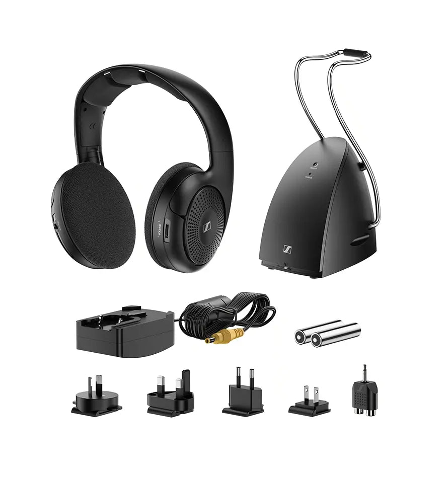 HDR 120-W headphones, TR 120-W transmitter with stereo RCA audio cable, Power supply with international adapters (EU, UK, US, AUS), Two AAA rechargeable NiMH batteries, Adapter for audio connection 3.5 mm, Quick start and safety guide
