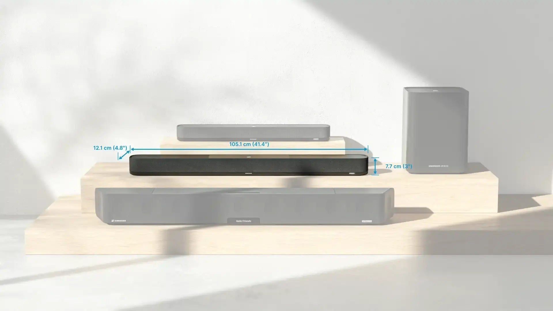 La barra de sonido está diseñada para funcionar con el ADN de audio de Sennheiser. Siete controladores de rango completo con cono de aluminio de alta gama garantizan una fidelidad increíblemente nítida y unos medios claros. Las cámaras cerradas albergan dos woofers de largo alcance de 4 pulgadas para graves de hasta 38 Hz.