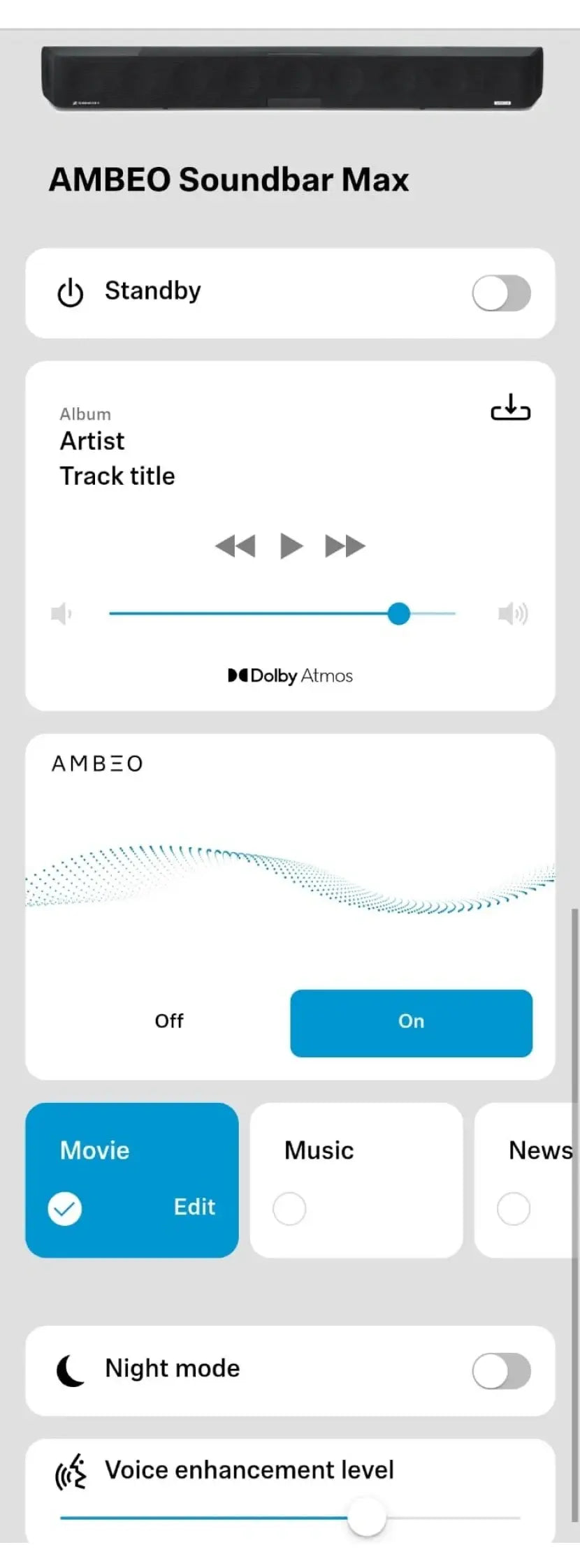 The Smart Control app places effortless sound control and personalization for your AMBEO Soundbar in the palm of your hand and has now been updated to support the new AMBEO | OS 2 features.